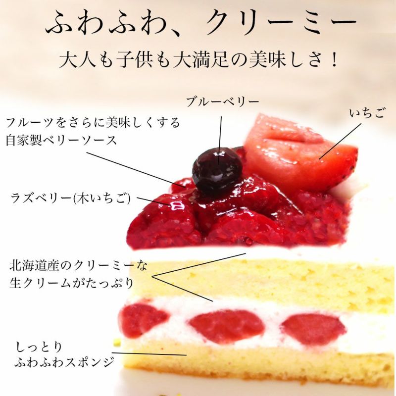 生クリーム、卵、苺、小麦粉、砂糖、ラズベリー、ブルーベリー、乳製品、植物油脂、乳、水飴、ココア、カカオマス、ココアバター、オレンジ、ヘーゼルナッツ、乳等を主原料とする食品、全粉乳、ブランデー、ゼラチン、加糖ぶどう糖液糖、ショートニング、バター、脱脂粉乳、モルトエキス、食塩、とうもろこしでん粉/乳化剤、香料、金箔、銀箔、カゼインNa、メタリン酸Na、酢酸、安定剤、ph調整剤、(原材料の一部に乳成分・卵・小麦・オレンジ・ゼラチン・大豆を含む)